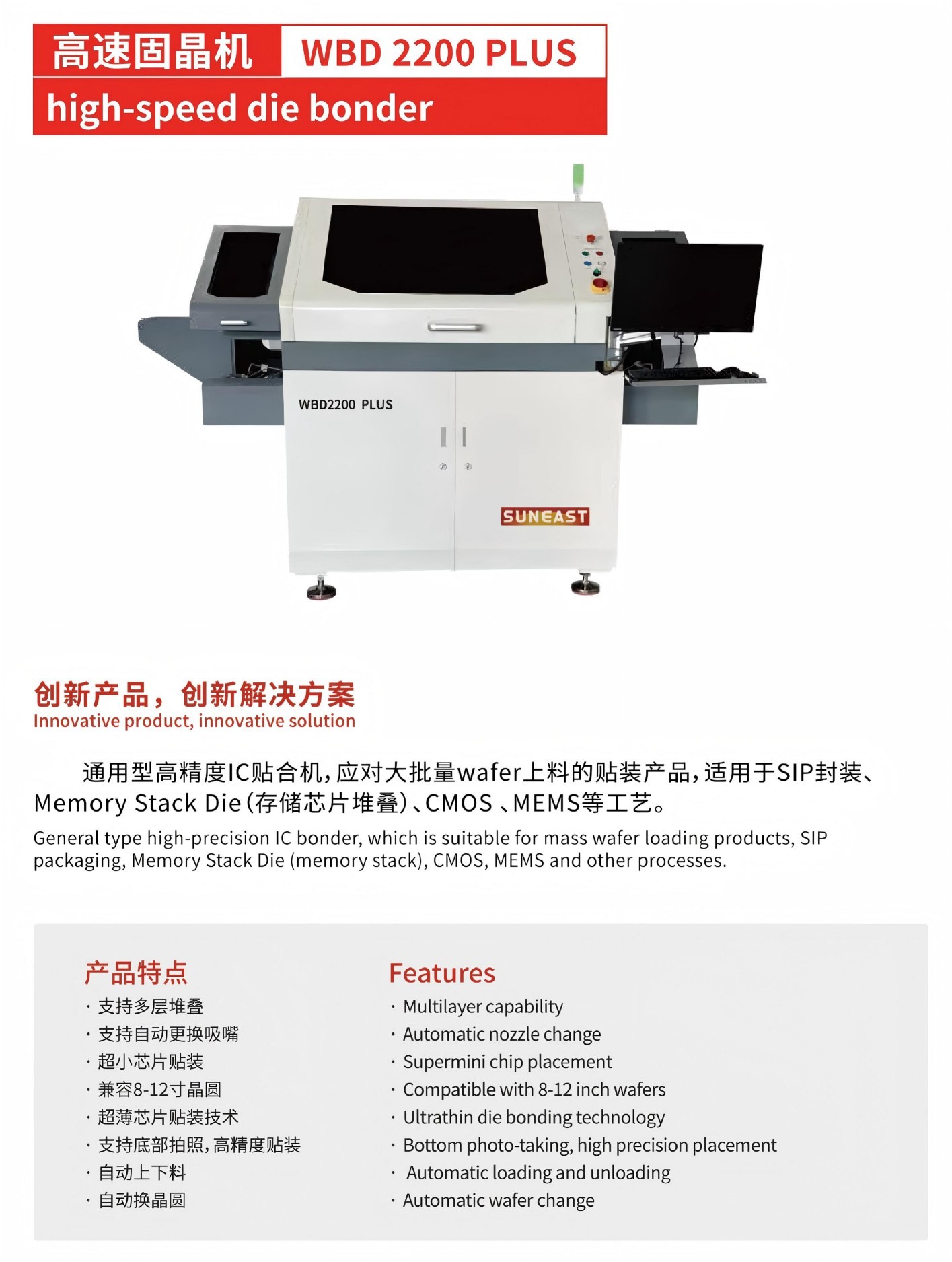 通用型高精度芯片貼合機,應對大批量wafer上料的貼裝產品,適用于SIP封裝、Memory Stack Die(存儲芯片堆疊)、CMOS 、MEMS等工藝。